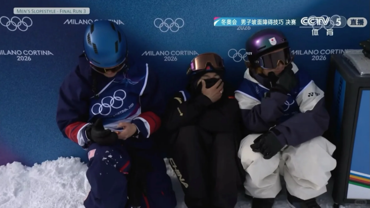 单板滑雪男子坡面障碍技巧决赛最后时刻,苏翊鸣和另外两名暂列前三的选手挤在雪地角落里,等着最后一名的新西兰选手完赛。三个人缩成一团,各怀心事,准铜牌选手紧张地刷着手机,准金牌选手苏翊鸣则干脆拉起面罩遮住眼睛,不敢直视。
